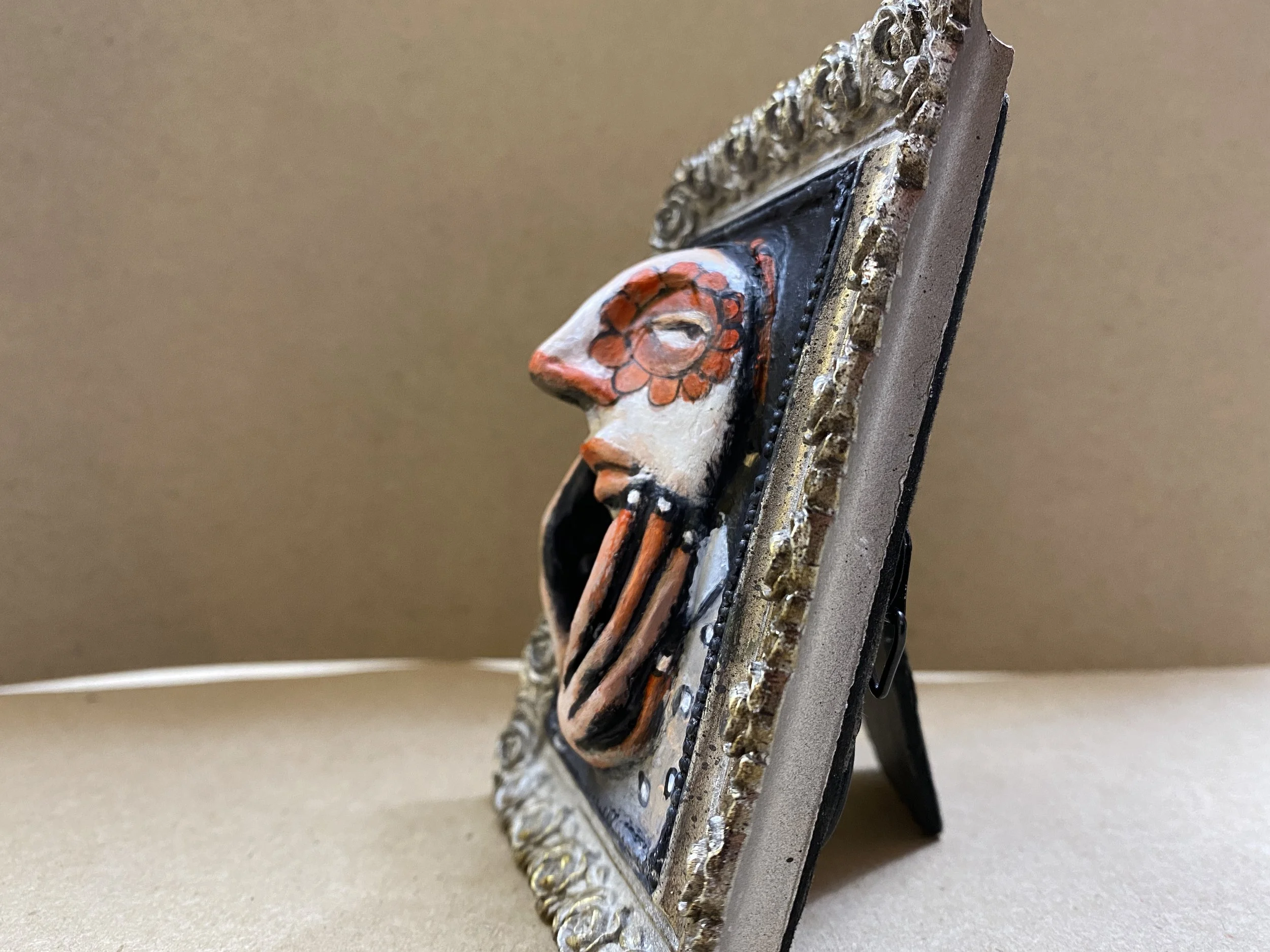 If you have been following my work this year, you will know I have been working with expressive hands in my clay work and, I knew I wanted to continue with this feature, in my little frames. I spend a bit of time placing my character hands around her tiny face to add more emotion to slightly tilted head creating so much more expression and drama to this piece.