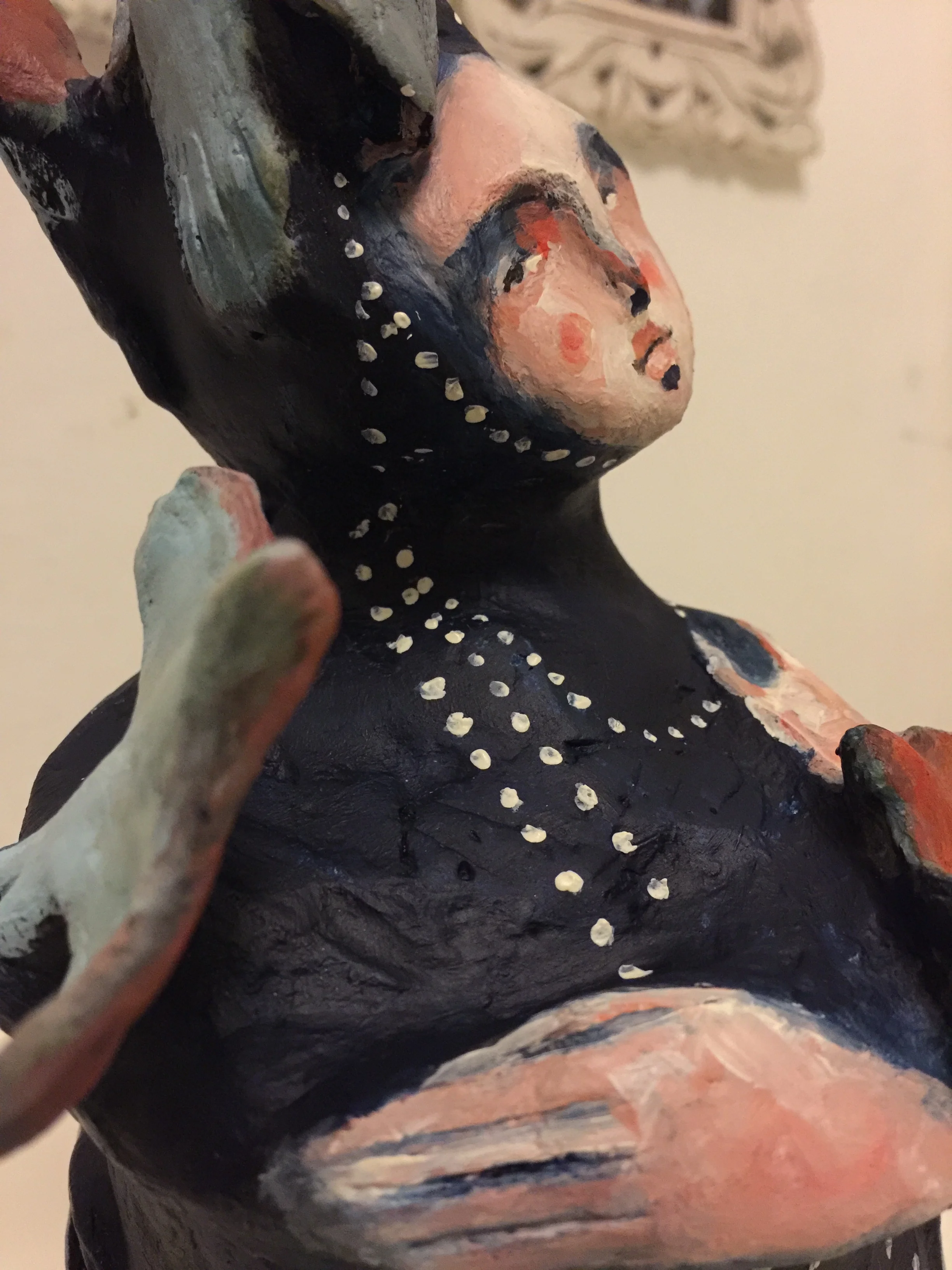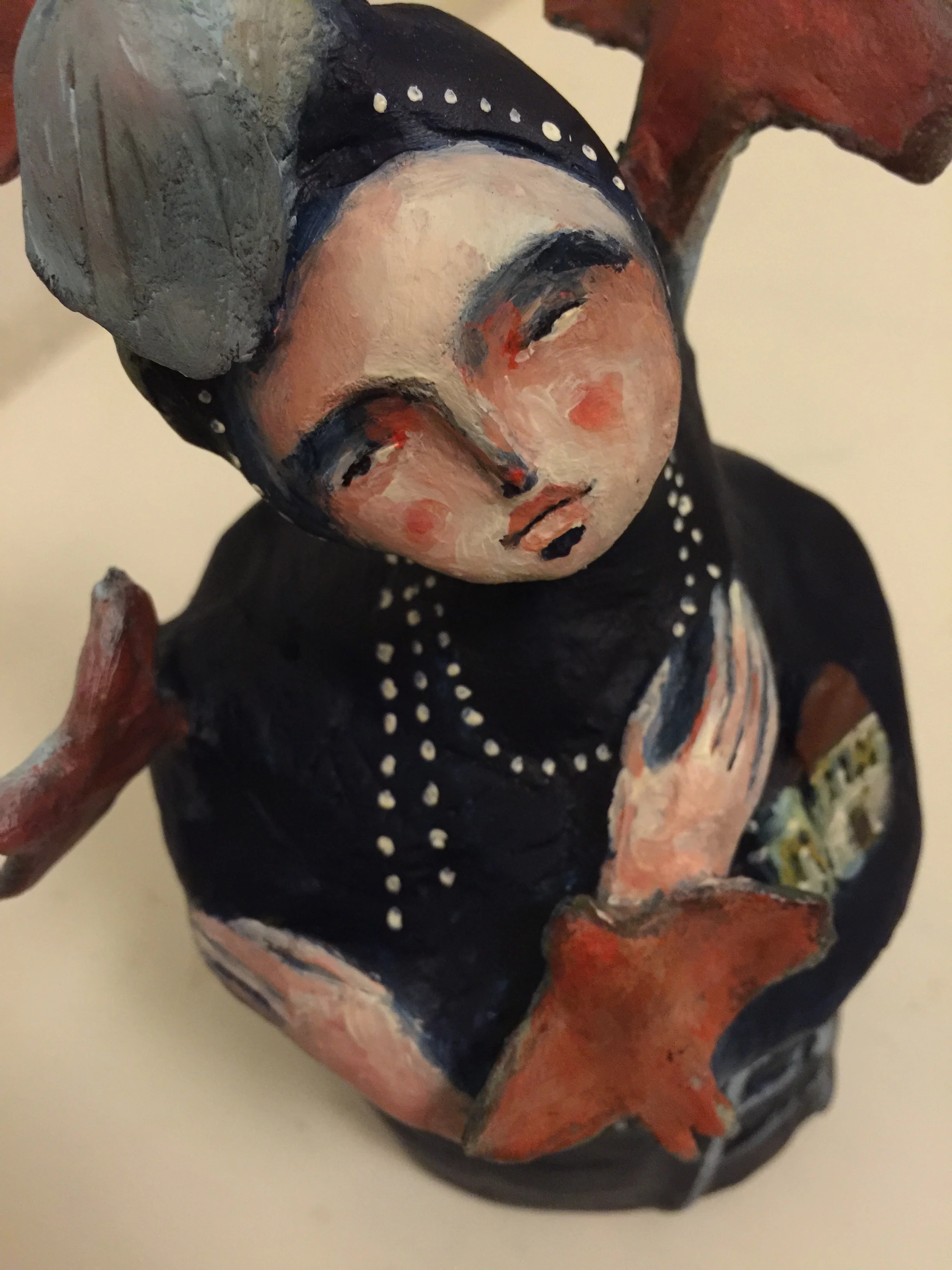 Seriously though, her hands and her tender-hearted face, was worth every hour I tried to rescue her. Up until now all my hands have been the same color as the bodies but I wanted her elegant hands to be seen as they added so much emotion to her story. It was the first time I painted hands and it completely transformed her. The birds took about 3 different coats to settle on the color that I loved. There is no doubt, she was hard work and she made my earn the right to her presence. Maybe that's why I love her so much.