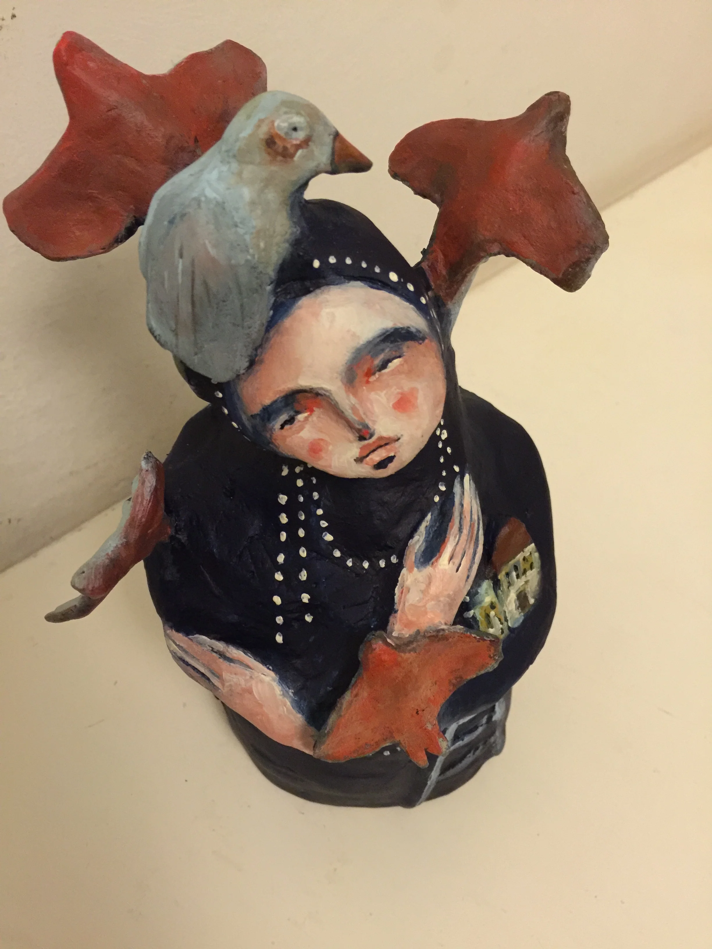 Considering she almost didn't make it and I almost gave up on her 3 times, I'm amazed at how connected I feel to her. From the beginning I wasn't happy with her at all. She felt clumsy and her neck was too short and thick and her face and body proportions just felt so off for me. Creating birds around and above her head, gave me the height I was after. When I was rebuilding her, I completely overcrowded her with birds so much so that I had to remove some of them to make her less cluttered... yip a struggle all the way through.