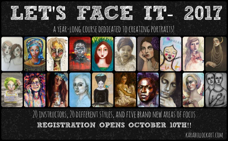 I'm beyond excited to share with you that I'm going to be one of the guest teachers for Let's Face It 2017. It's a year long, online art class created and hosted by Kara Bullock, focusing on many aspects but specifically, creative portraiture. It is for all levels: beginners to advanced. The 2017 Let's Face It class has an exciting new line up of amazing teachers with five new areas of interest, with some exciting extra's too.