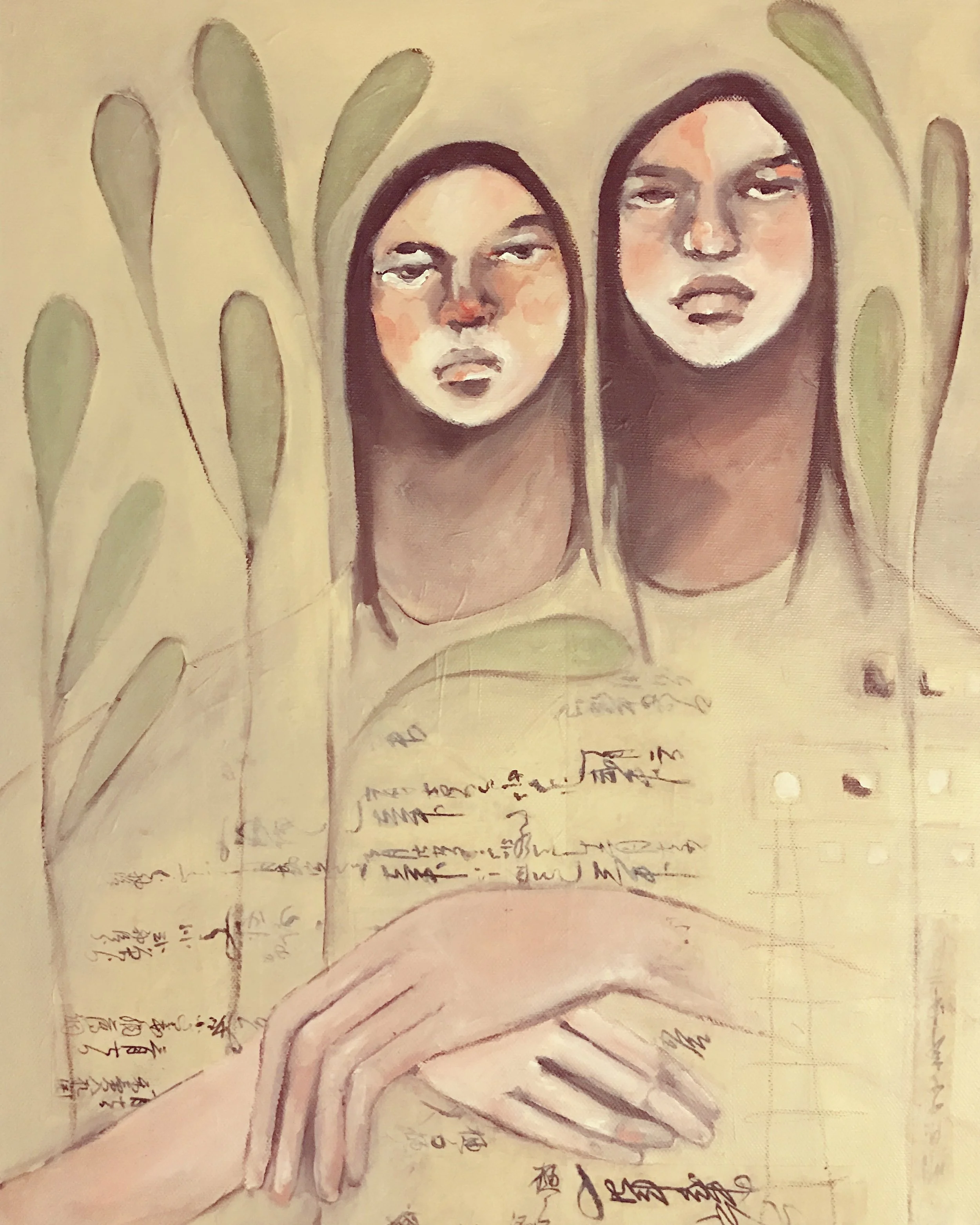 This piece has changed 3 times for me and I finally love these two girls. I'm enjoying the gentler colors and script across their chests and the additional hand that is bigger than the other hand.