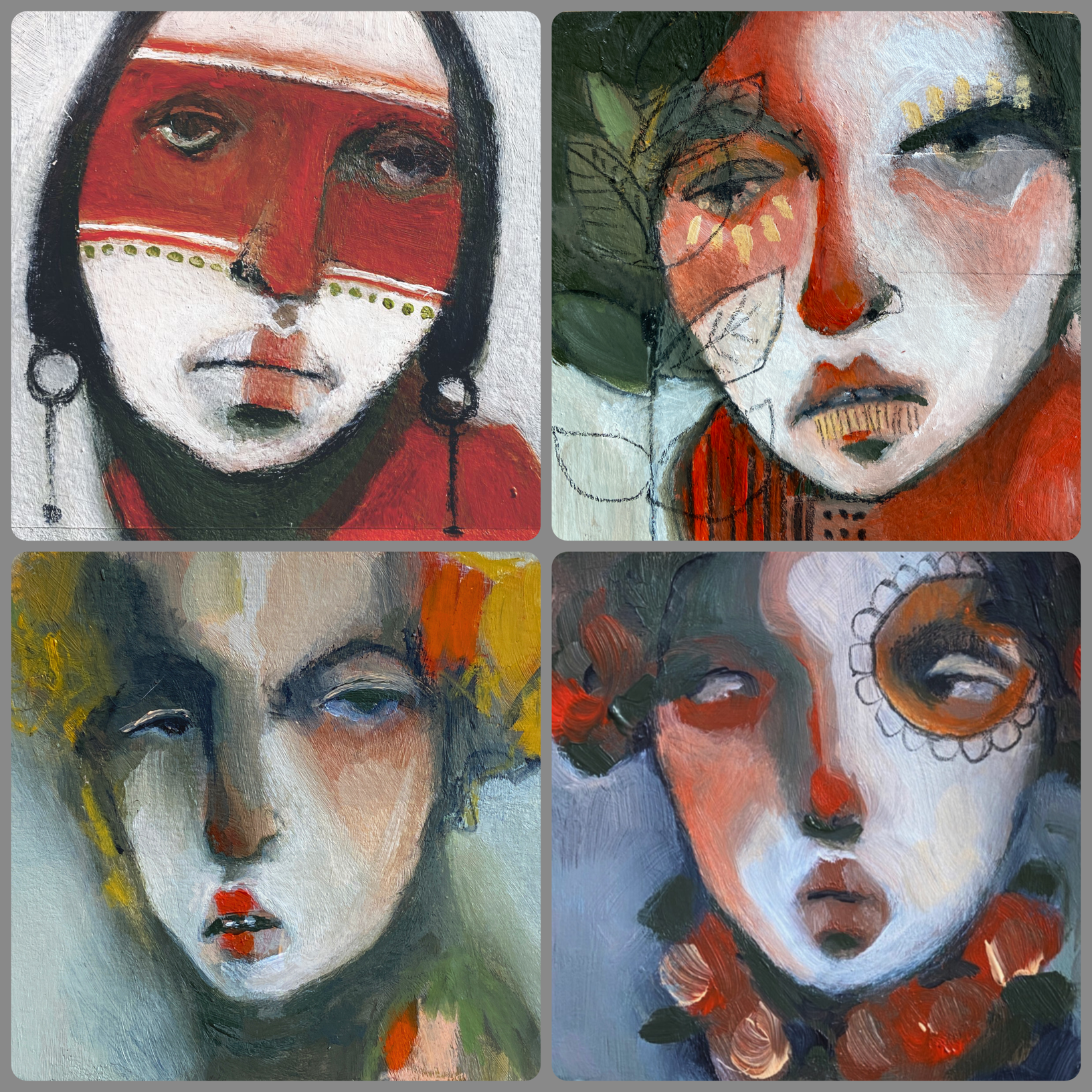 I have been working on this exquisitely odd pair and loving every brushstroke. If you know anything about me, you know I kind of love oddness and right now, I am just allowing them to lead the way with their quirkiness. I know they might change a 100 times before I call them done so once again, I am not locking into anything yet. Their big beautiful hands are calling me and I can’t wait to head there next.